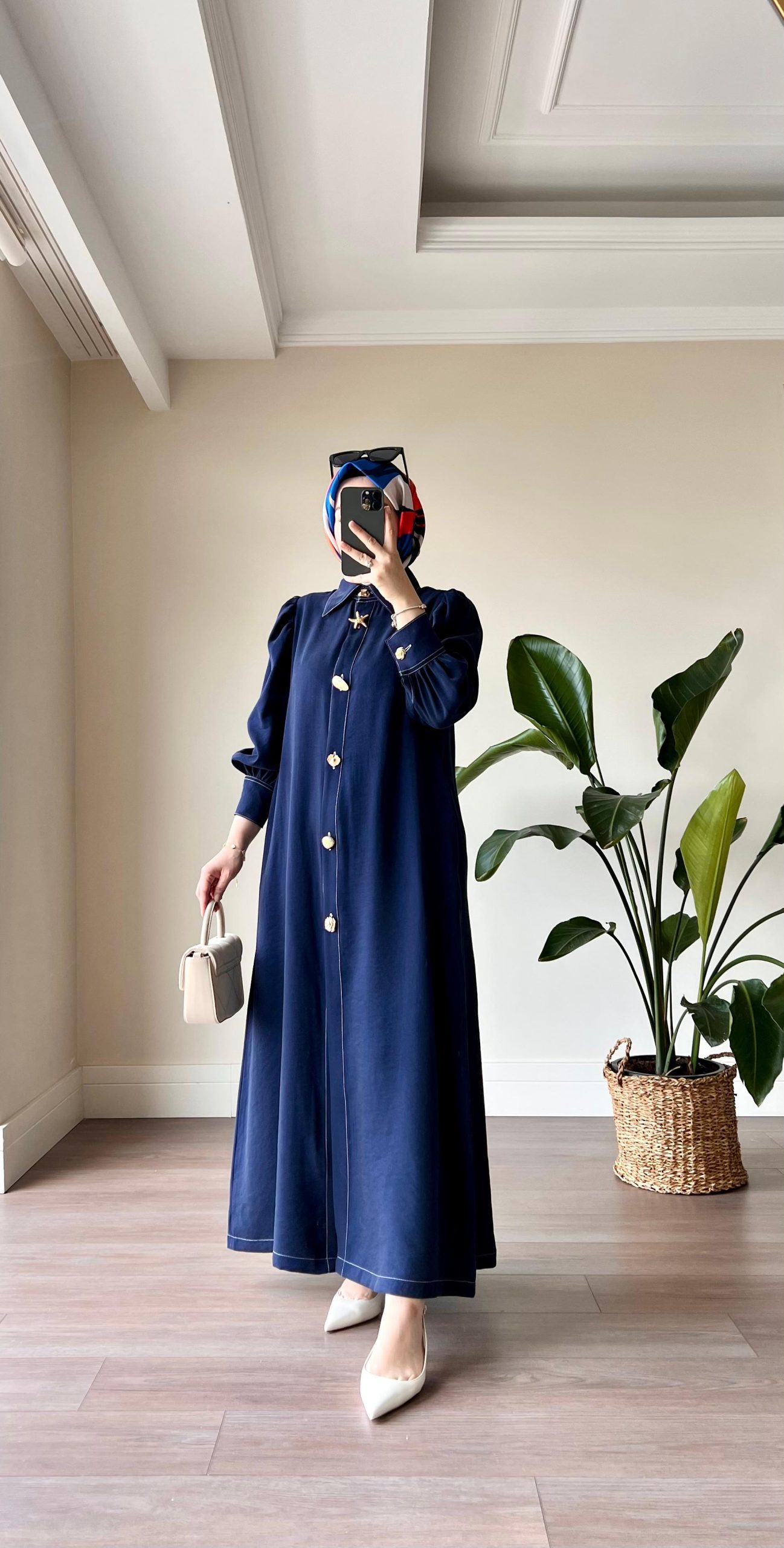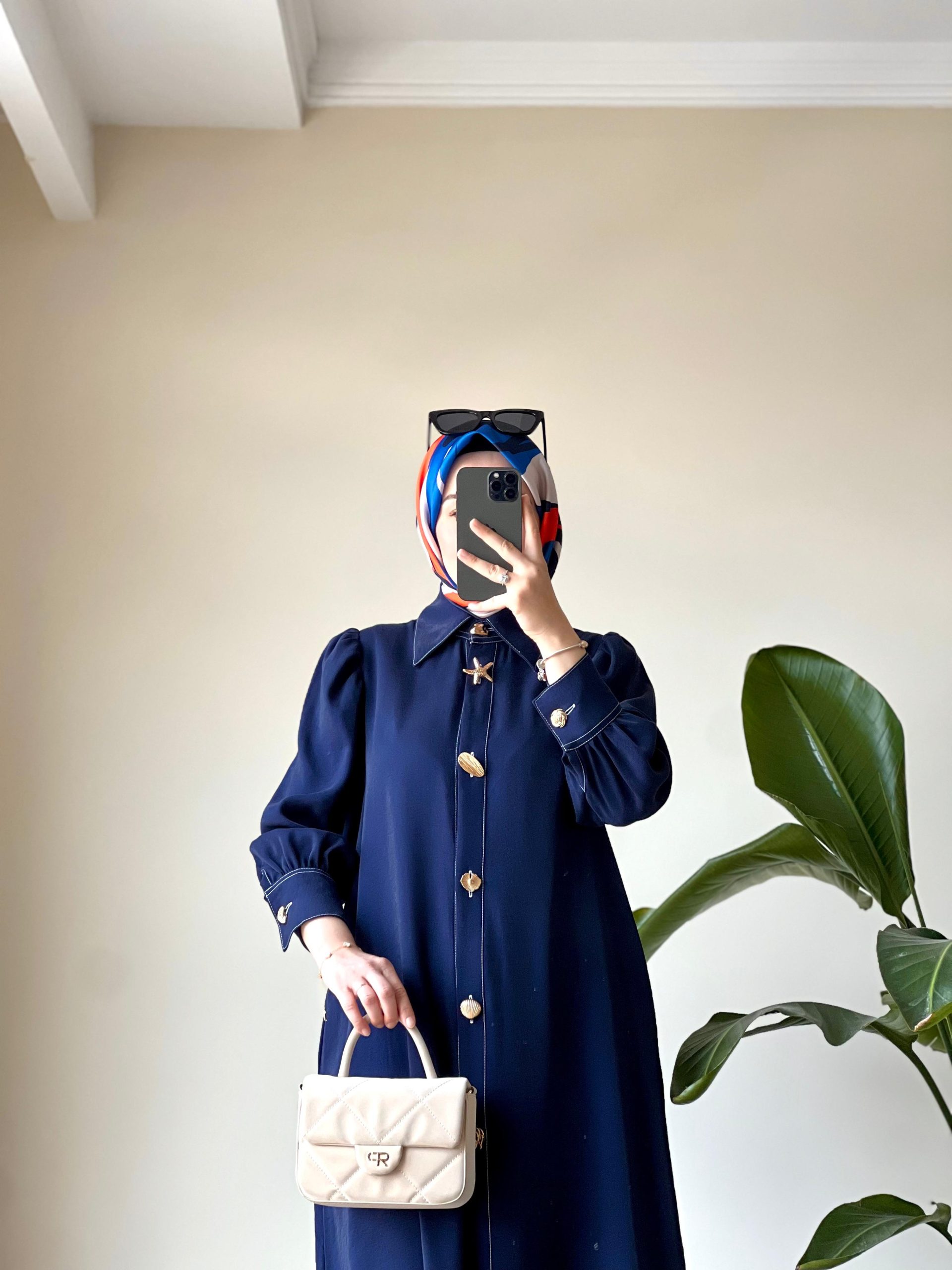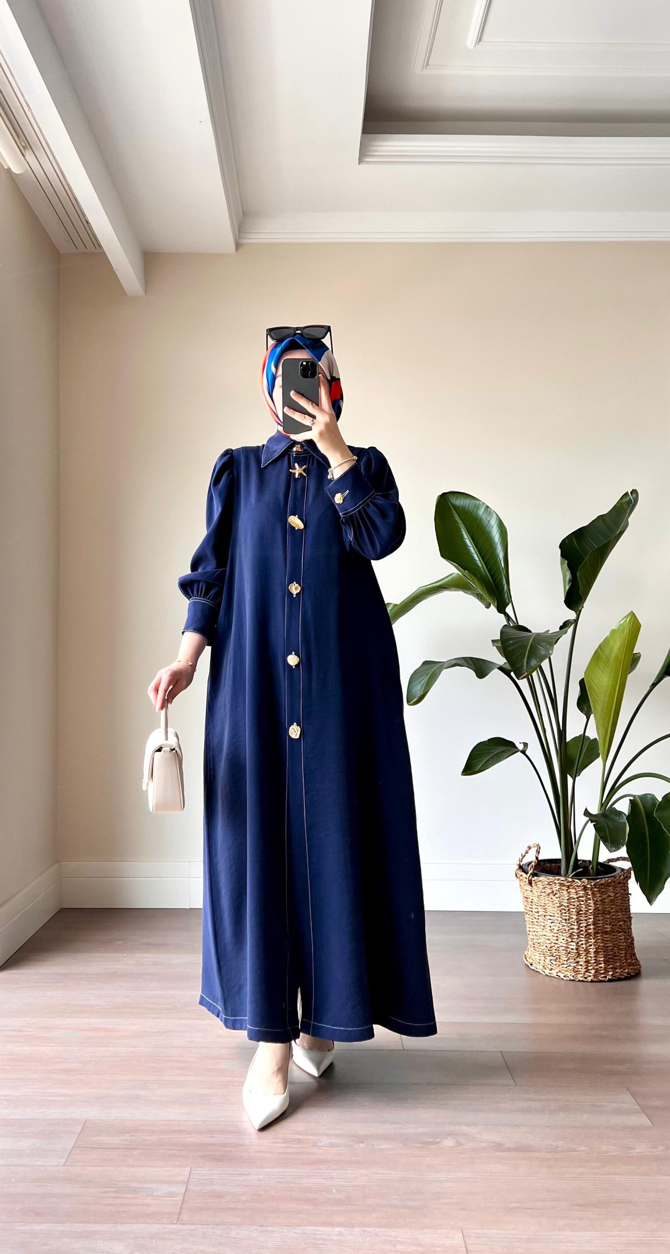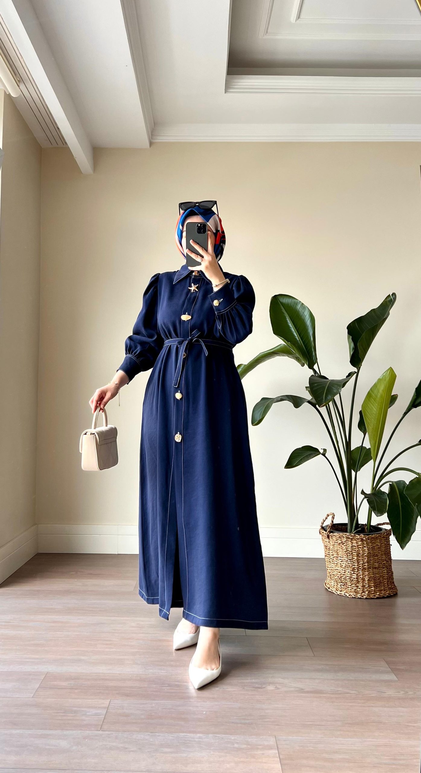Kontrast Dikişli Taşlanmış Trenç Ferace Lacivert