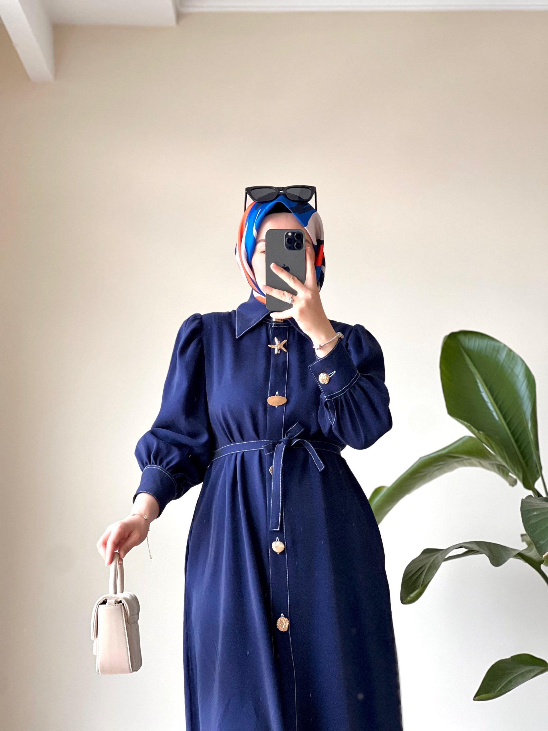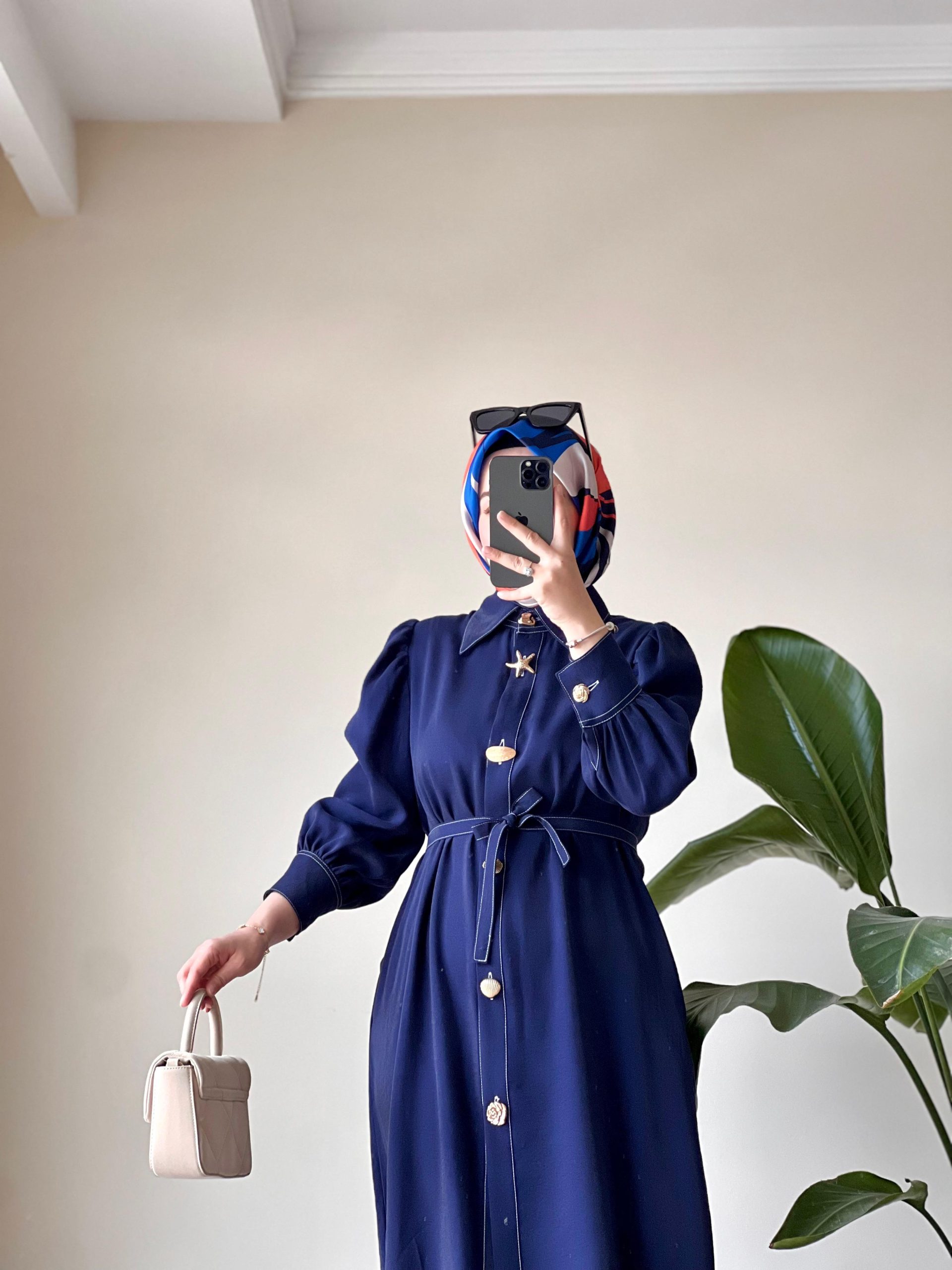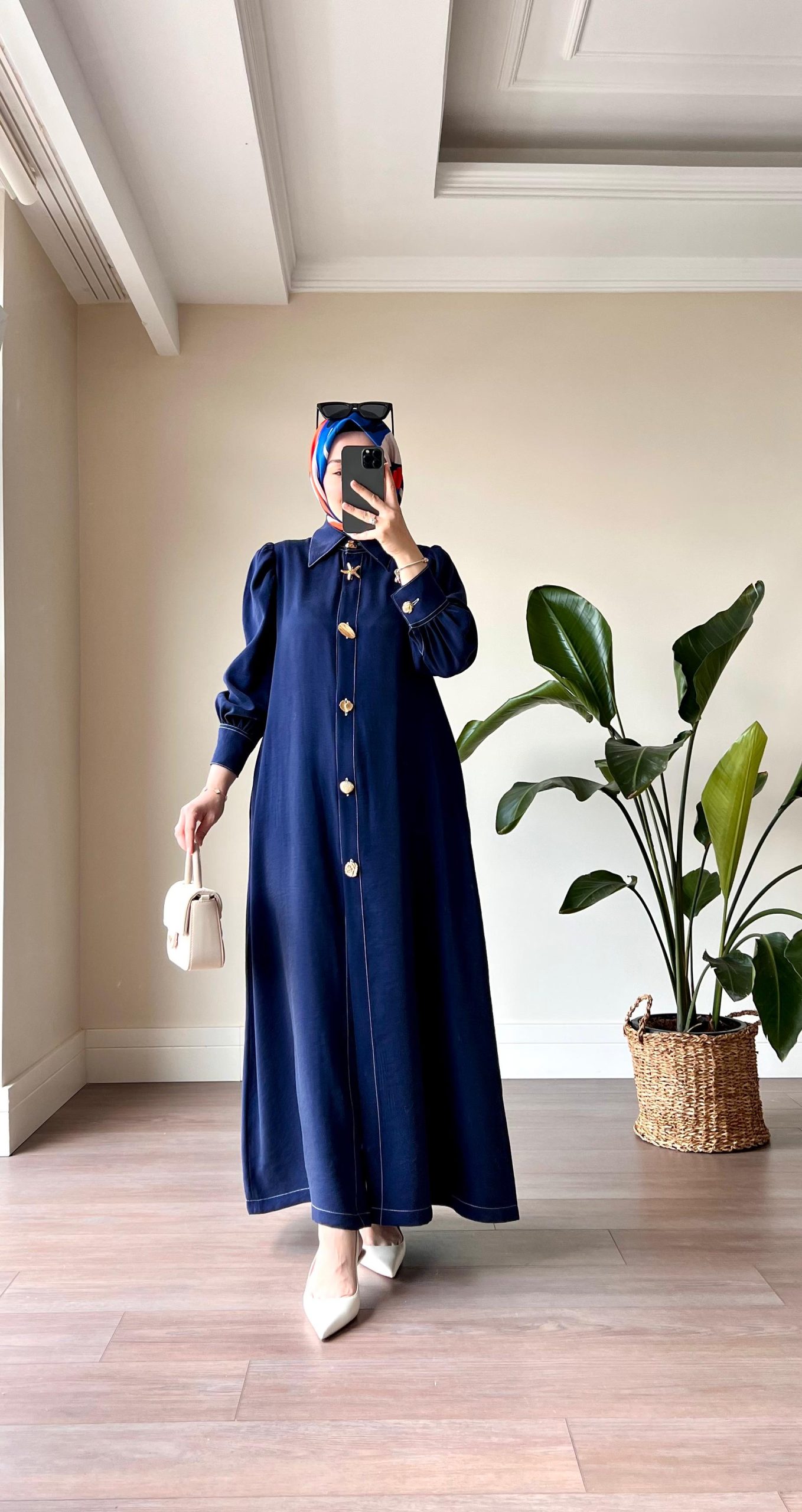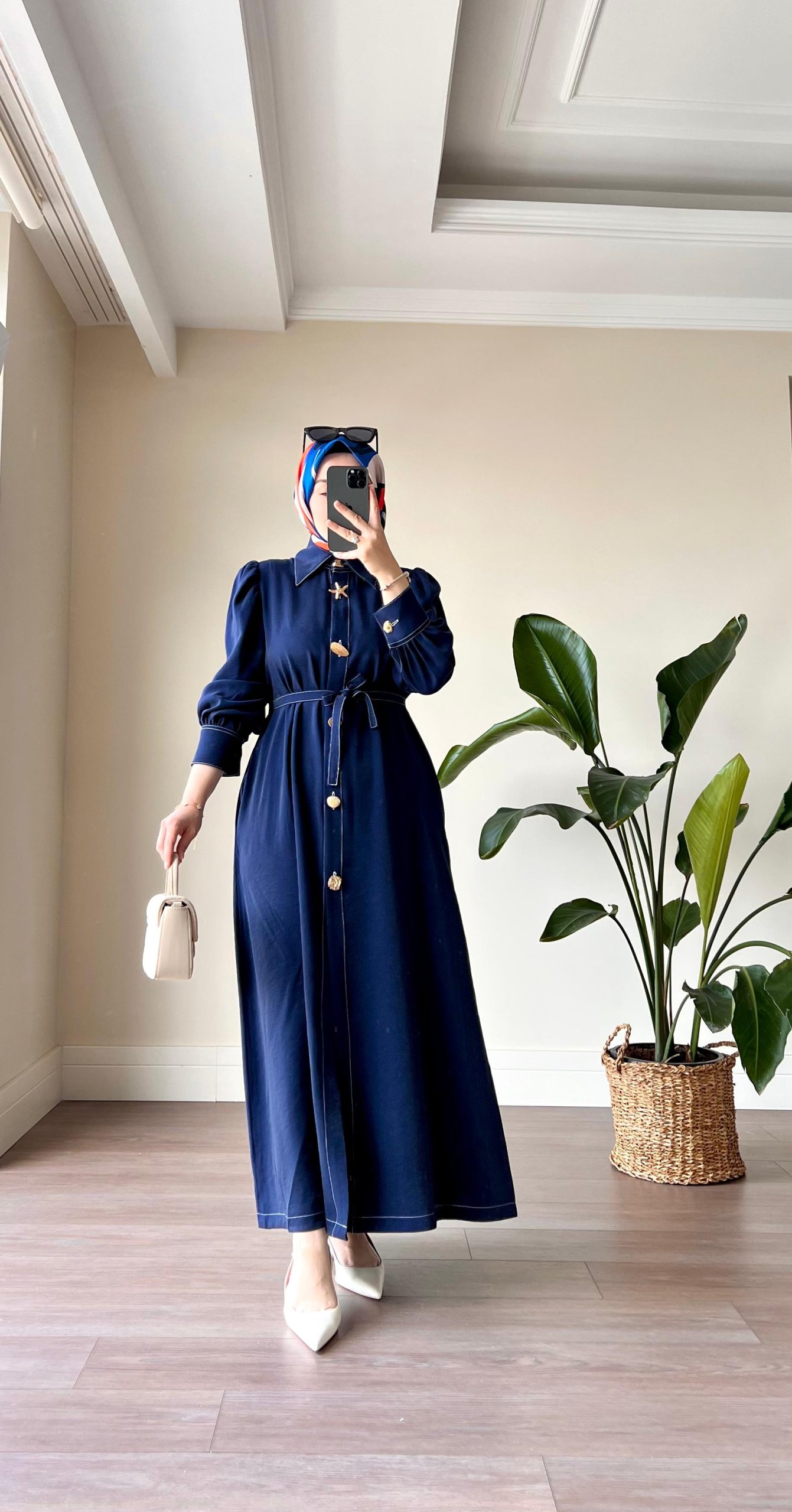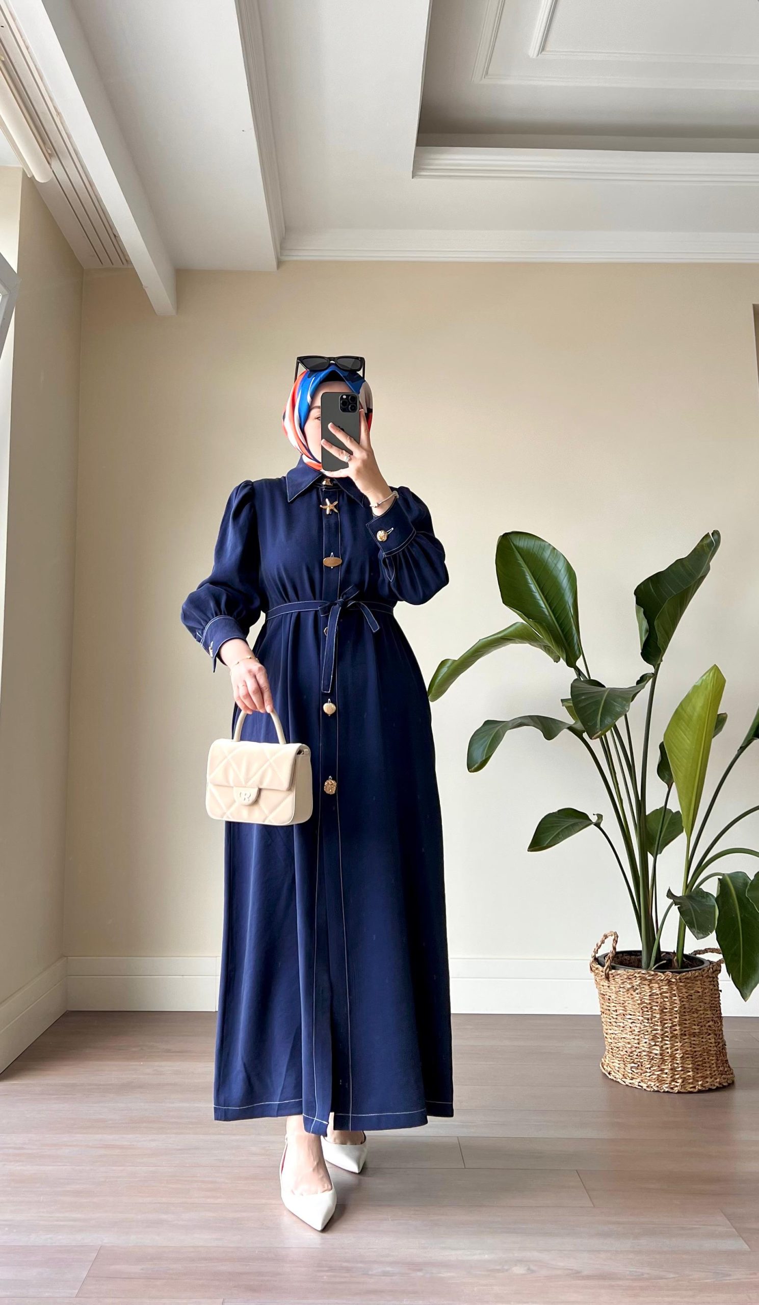 Kontrast Dikişli Taşlanmış Trenç Ferace Lacivert
